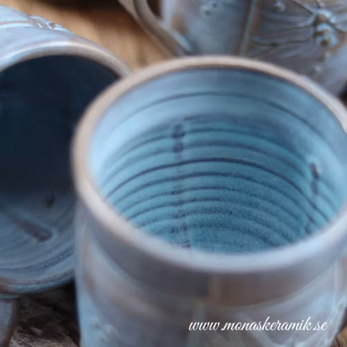 - Nu doppar jag ner koppen i glasyrhinken. Efter att glasyren torkat rengör jag undersidan mycket noga så att inte koppen fastnar på plattorna i ugnen när jag glasyrbränner. Koppen ställs sedan in i ugnen och bränns upp till 1240 grader.